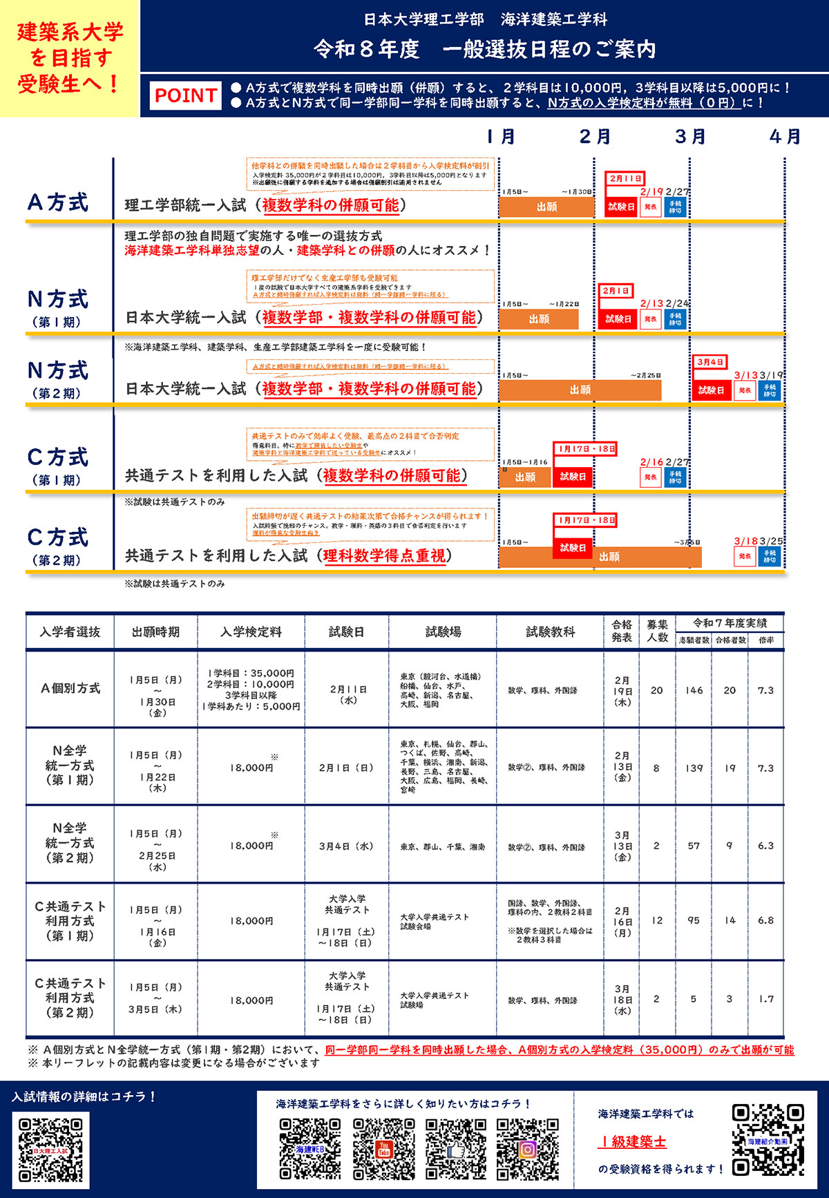 INFORMATION インフォメーション 入試情報 アドミッションポリシー 総合型選抜 一般選抜 大学院入試 【年明け一般選抜】 受験方法決定フローチャート 共通テストを利用しますか? は い C方式1期・2期へ C方式2期は理数科目重視!! 国語 『数学Ⅰ,数学A』『数学Ⅱ,数学B,数学C』 物理 化学 生物 地学 英語 上記から2教科2科目(「数学」を選択した場合は2教科3科目)選択 いいえ 海洋建築工学科だけを受験したい!! は い A方式へ 同時出願でN1, N2方式の受験料が無料!!お得です!! 数学 理科 外国語 いいえ どこと併願する? 理工学部 建築学科、まちづくり工学科など A方式へ 同時出願で受験料が、2学科目は10,000円!!、3学科目以降は5,000円!! 数学 理科 外国語 他学部 生産工学部、工学部など N1, N2方式へ 数学② 理科 外国語 一般選抜日程のご案内 一般選抜日程についてのご案内です。以下の画像または一般選抜日程資料のボタンをクリックすると表示されます。 令和8年度一般選抜日程 一般選抜日程資料 入学者納入金一覧 2026年度入学者納入金一覧について、PDFで公開しています。 入学者納入金一覧 入試情報(学部サイト) 理工学部の入試情報ページには、入学者選抜日程や、募集要項、募集人数などの情報が掲載されています。下記ボタンからアクセスできますが、5月中旬頃に令和8年度入試情報に書き換わる予定です。 理工学部入試情報